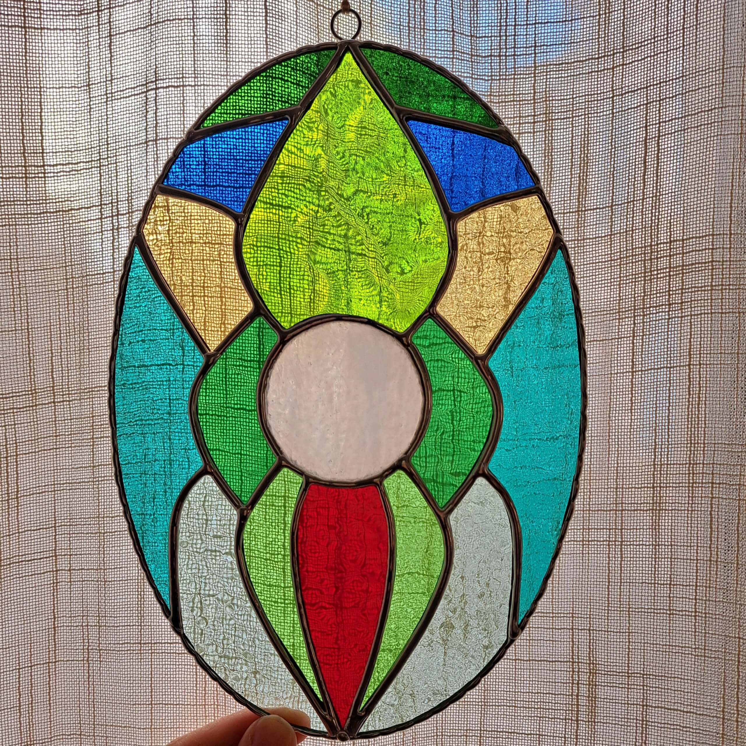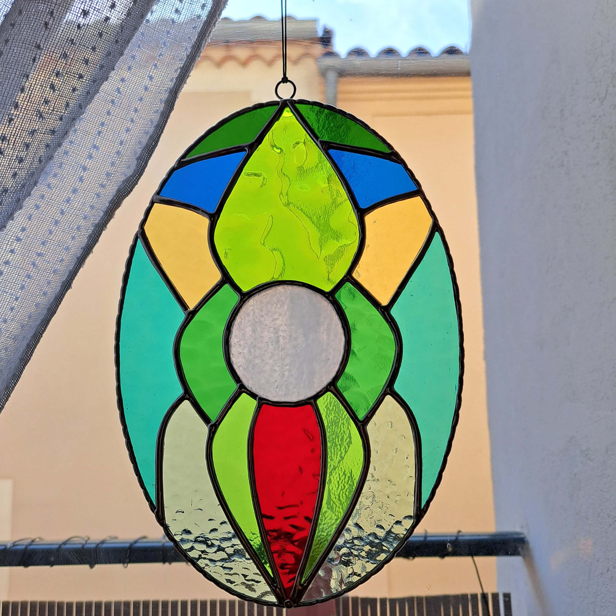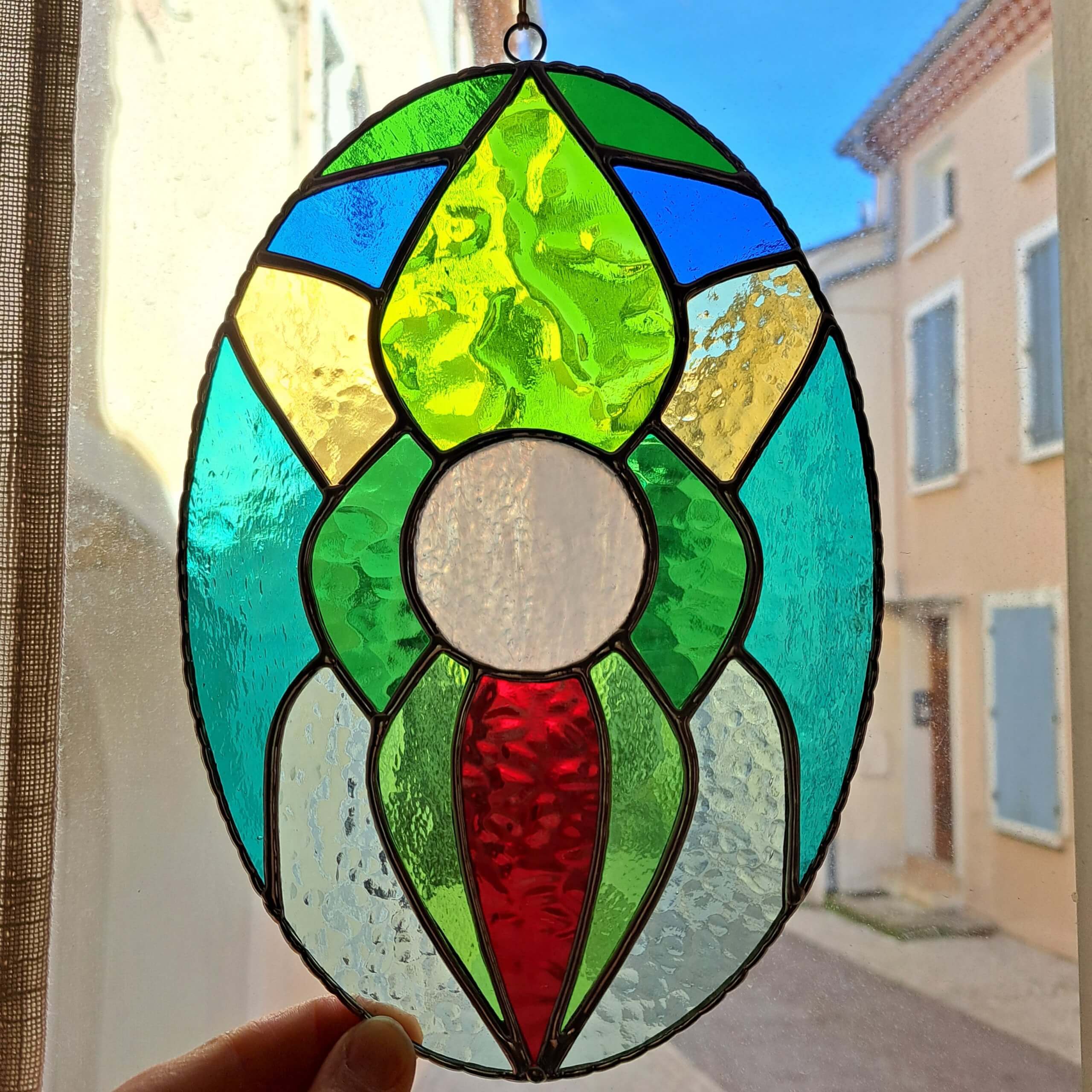Un joli vitrail abstrait très coloré à poser sur une étagère ou à accrocher chez soi, sur un mur ou devant une fenêtre.