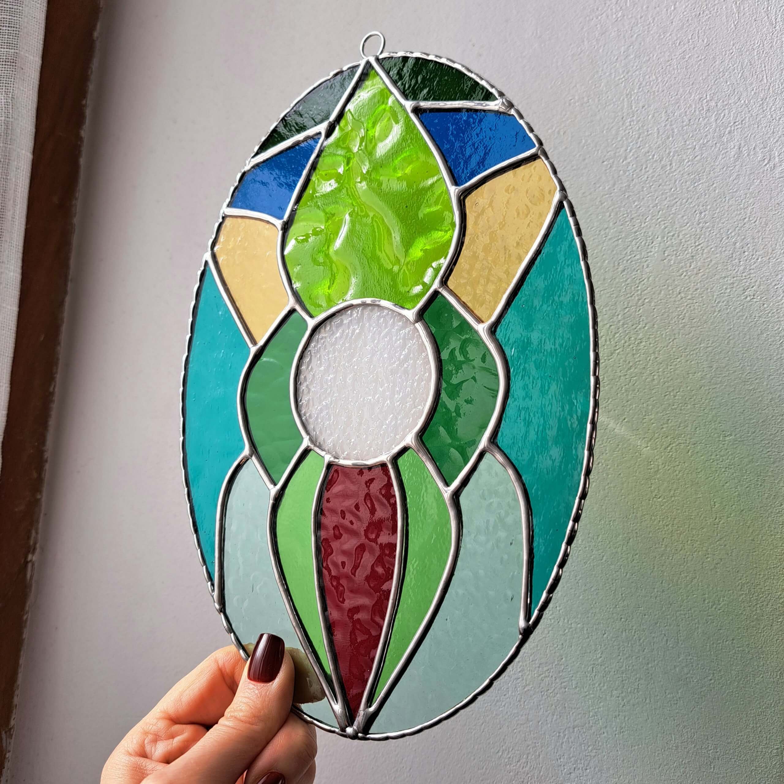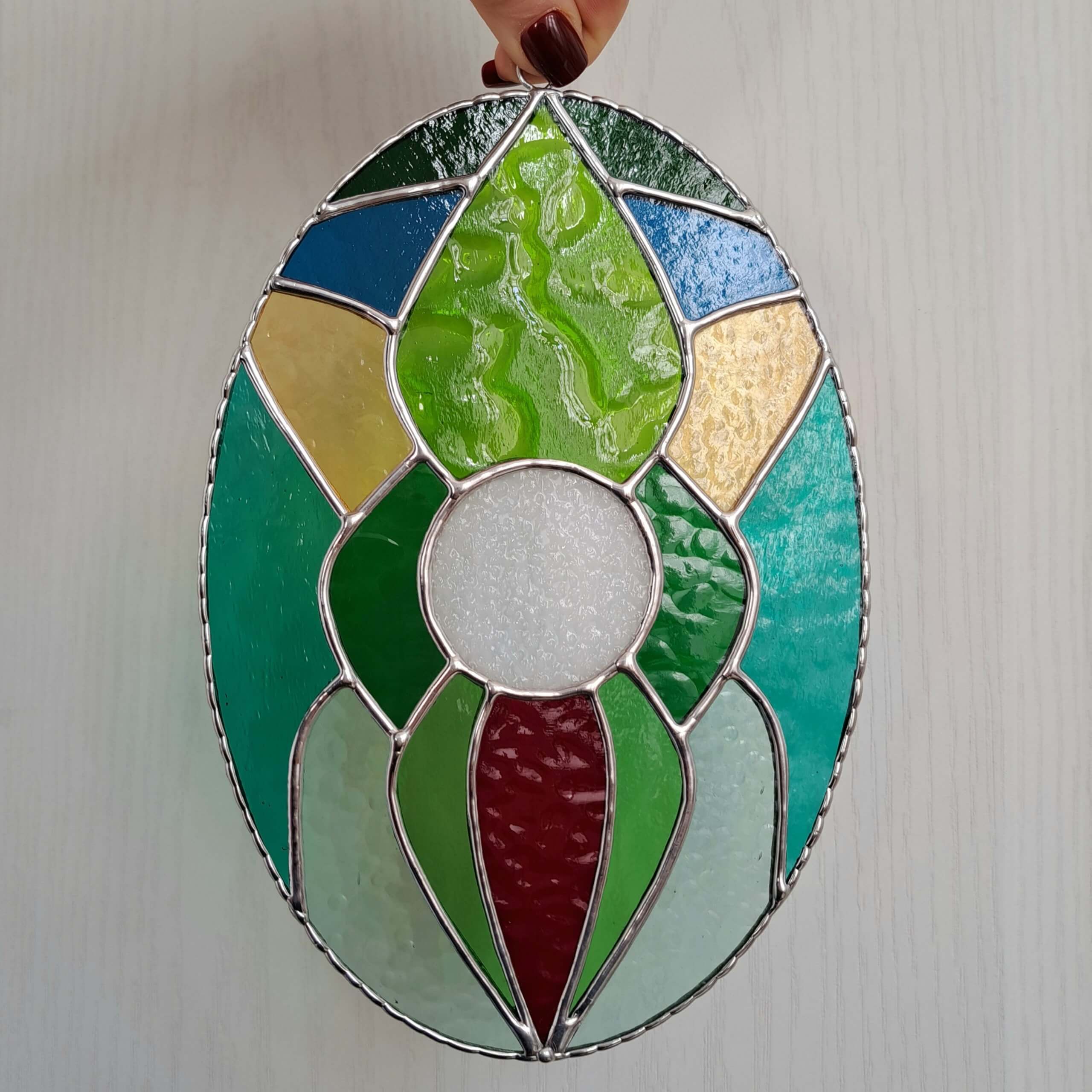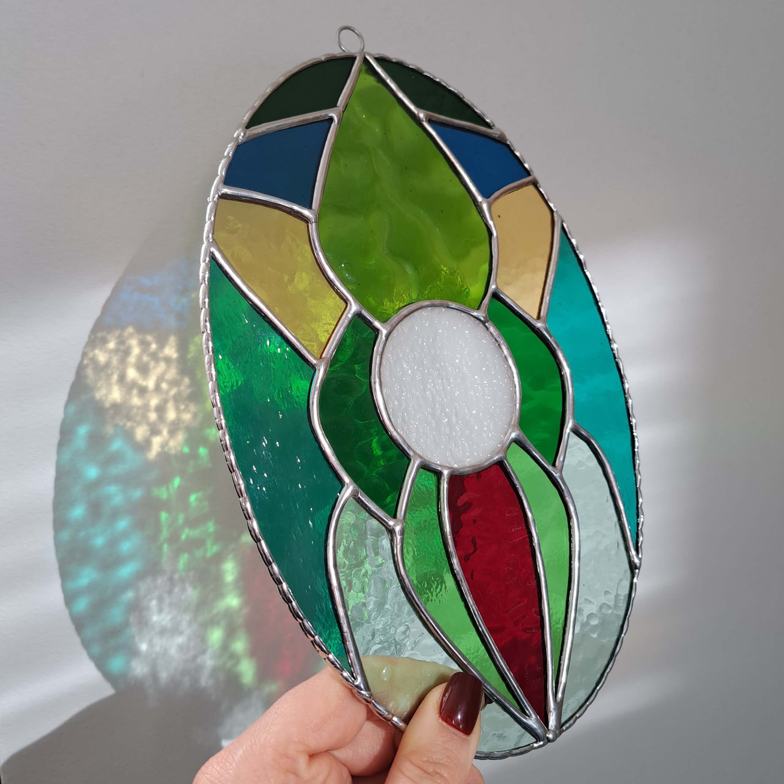 Un joli vitrail abstrait très coloré à poser sur une étagère ou à accrocher chez soi, sur un mur ou devant une fenêtre.